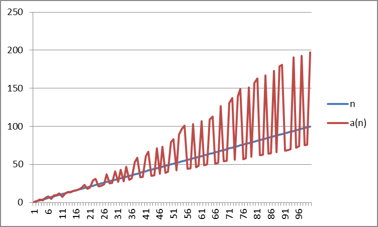 Sequence b(n) is unsorted and contains repetitions; let's sort it and remove duplicate positions, obtaining strictly increasing sequence x(k):