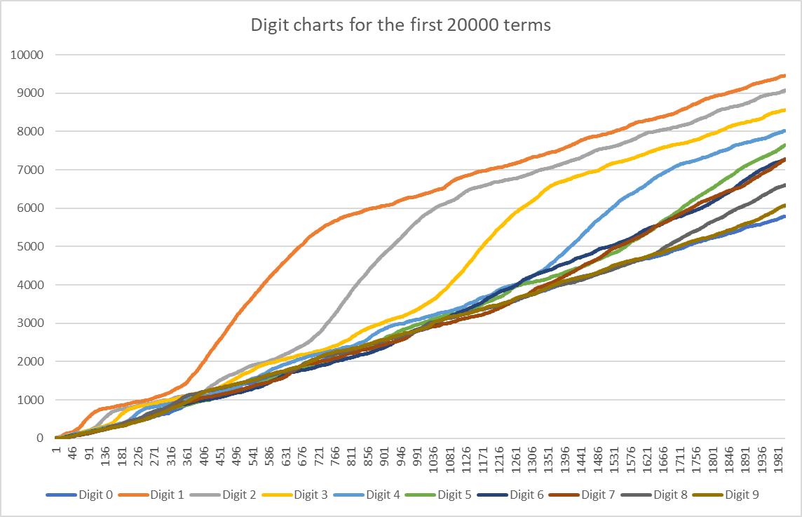 Here below is a graph of the number of different digits for the first 2*10^4 terms.