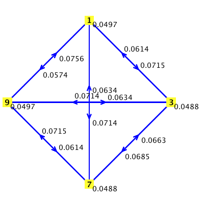 If one adds these probabilities, either for the arrows pointing away from a vertex or pointing towards a vertex the result is 0.25 as is to be expected.