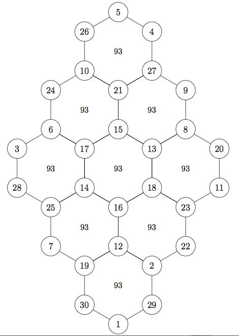 It's already known that if you fill the 30 vertices with the integers 1-30, no repetition allowed, there are several solutions with magical constants that vary from 77 to 109.