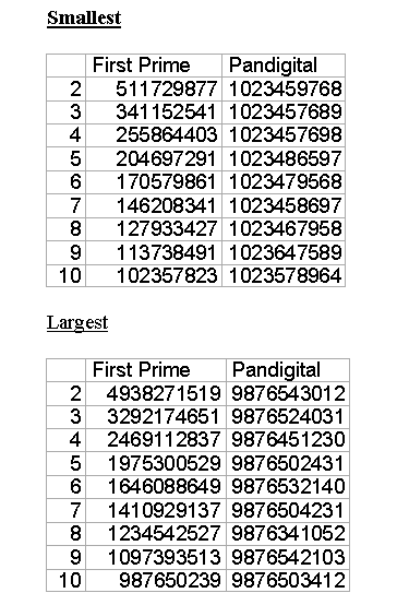 Problems & Puzzles: Collection 20th ![]() Coll.20th-015. Consecutive primes and Pandigitals On May 6, 2018, Rodolofo Kurchan, wrote: