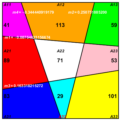 More over, there is not a way to compute the ulterior 9 areas from the only knowledge of the 4 slopes, first of all because you need to define a numerical size for the perimeter square.